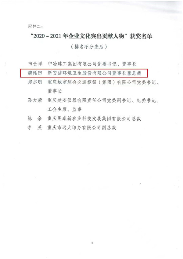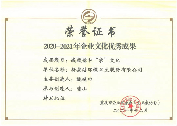 此次表扬中,,,,,,bb电子游戏官网情形卫生股份有限公司获“2020~2021年企业文化先进单位”,,,,,,魏延田董事长获“2020~2021年企业文化突出孝顺人物”,,,,,,由魏延田董事长主创的《诚毅信和“家”文化》效果获“2020~2021年企业文化优异效果”。。。。。。